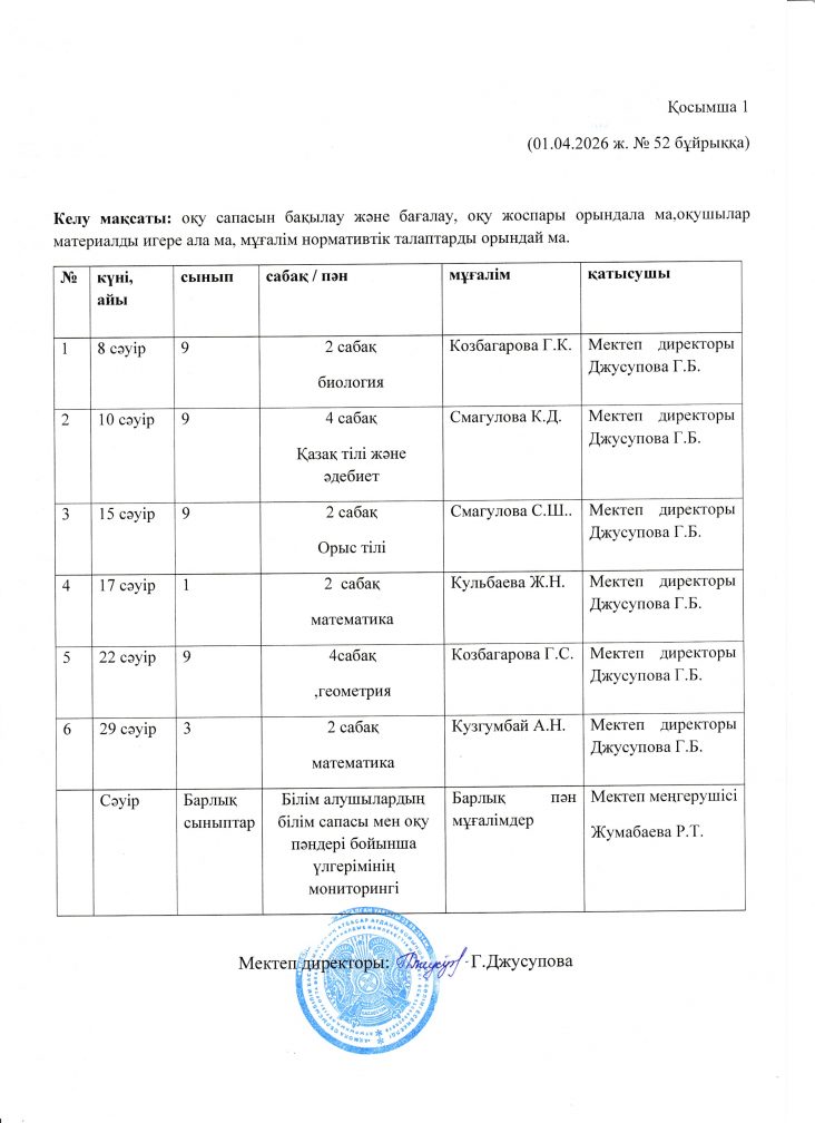 Әкімшіліктің сабаққа қатысу кестесі, 2026 жылдың сәуір айына арналған МБ жоспарына сәйкес