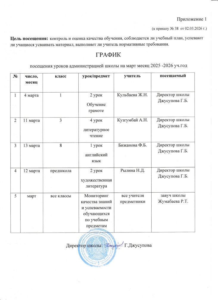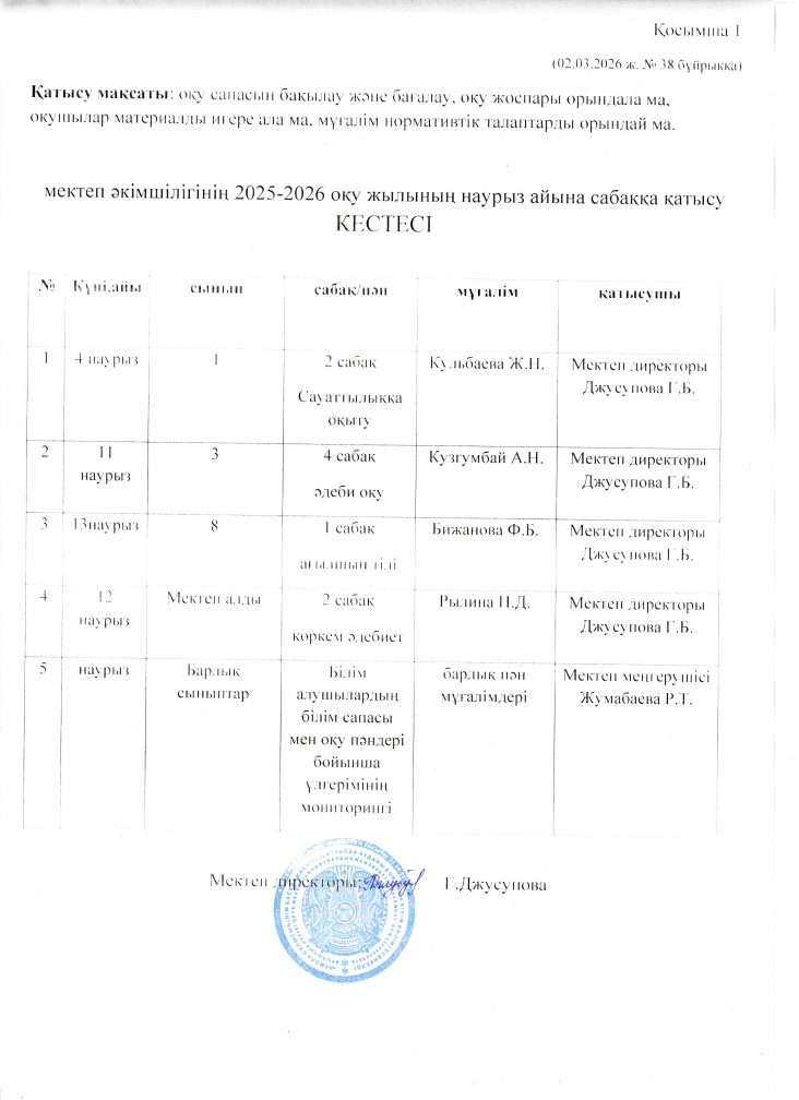 Әкімшіліктің сабаққа қатысу кестесі, 2026 жылдың наурыз айына арналған ЕЖК жоспарына сәйкес