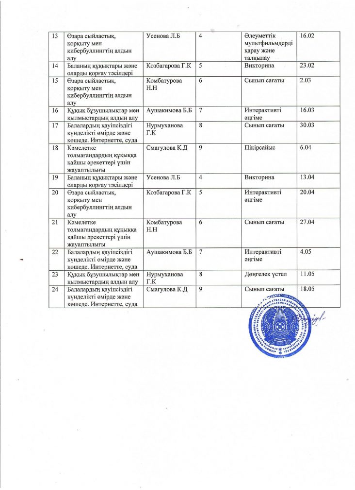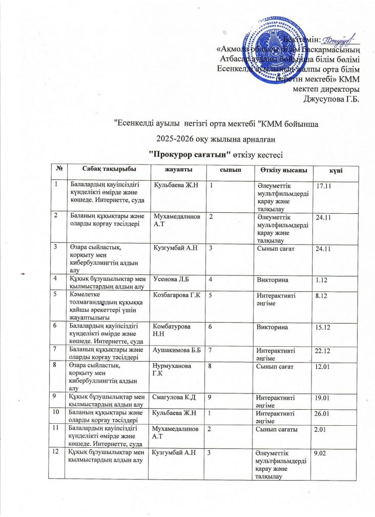 2025-2026 оқу жылына арналған" прокурор сағатын " өткізу кестесі