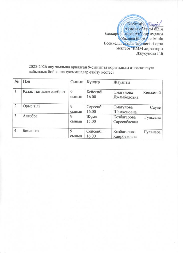 2025-2026 оқу жылына арналған 9 сынып оқушылары үшін қорытынды аттестаттауға дайындық бойынша консультациялар өткізу кестесі