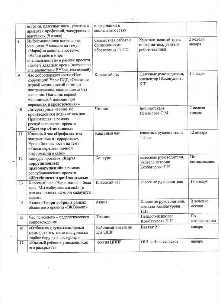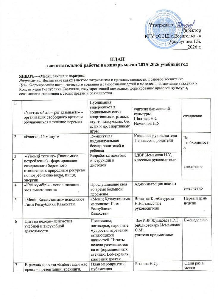 Тәрбие жұмысының 2025-2026 оқу жылының қаңтар айына арналған жоспары