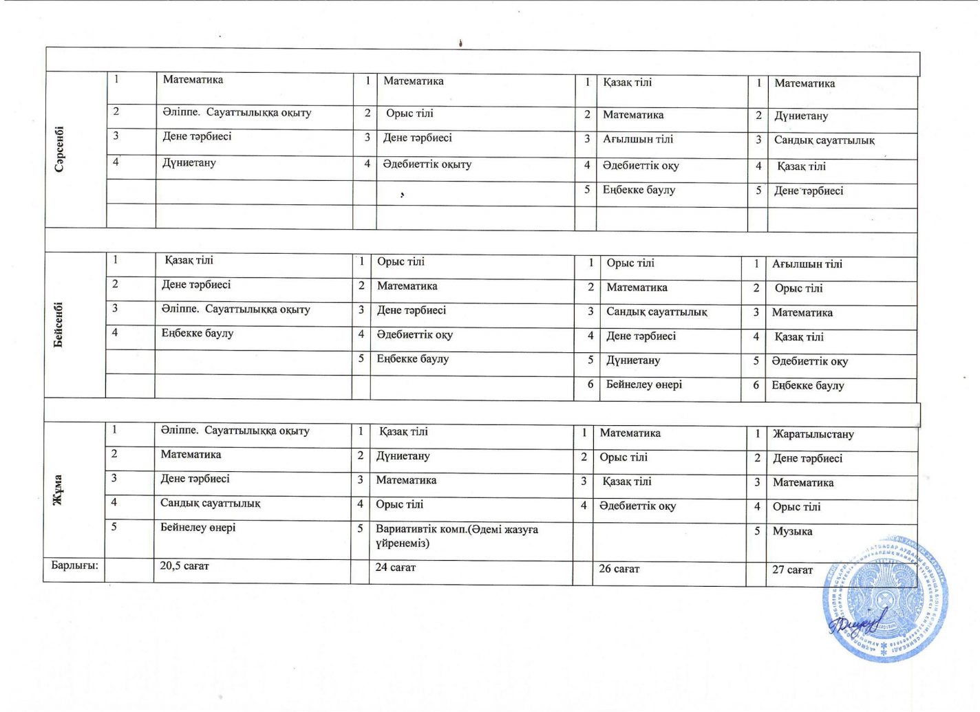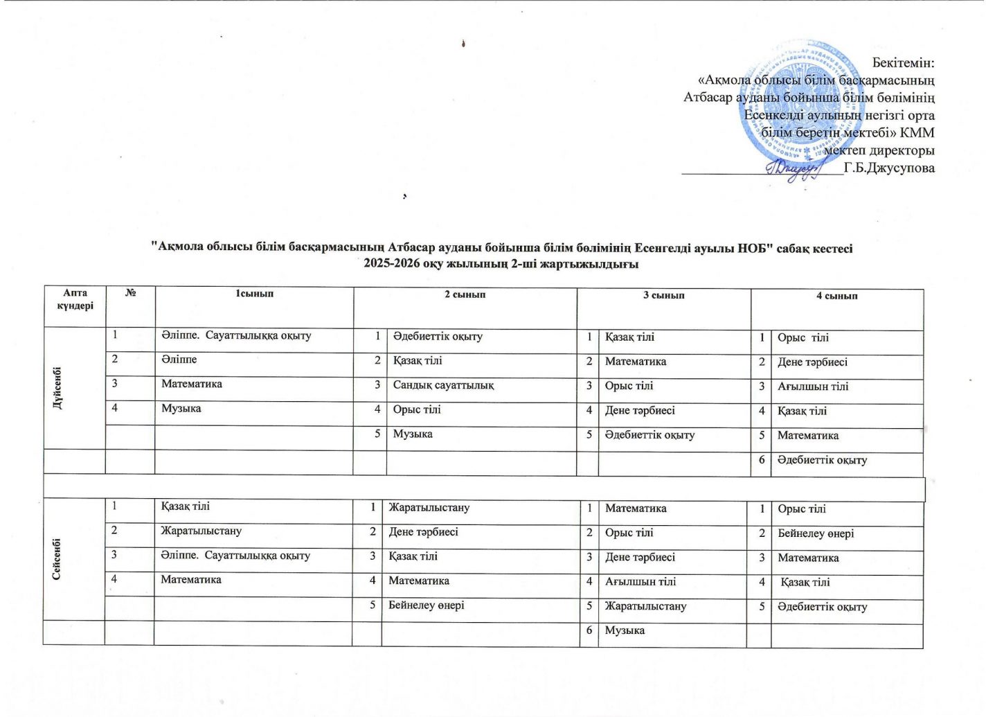 2025-2026 оқу жылының 2-ші жартыжылдығына 1-4 сыныптардың сабақ кестесі