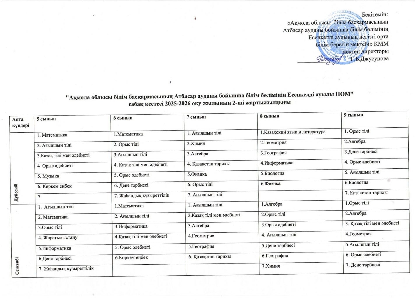 2025-2026 оқу жылының 2 жартыжылдығына арналған 5-9 сыныптар бойынша сабақ кестесі