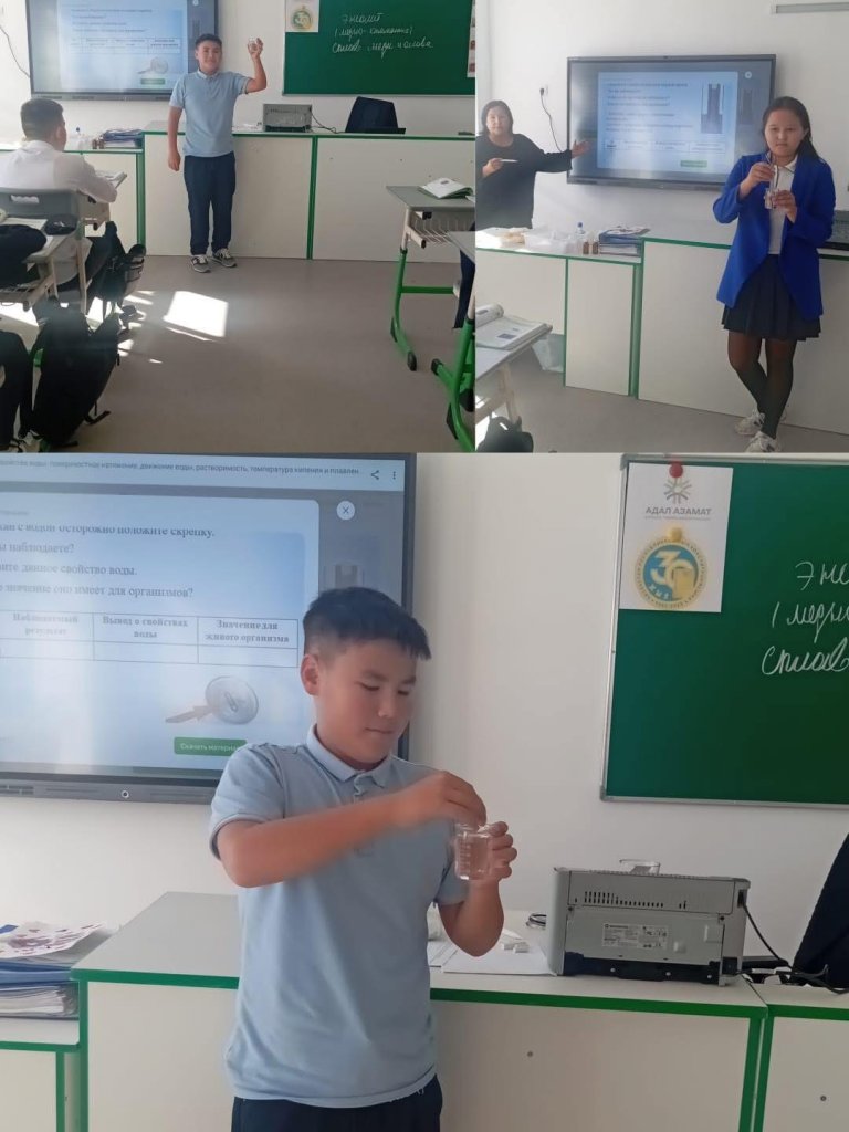 7 - сыныптағы биология сабағы-тақырып: "Судың қасиеттері: беттік керілу, қозғалыс, ерігіштік, қайнау және балқу температурасы, жылу сыйымдылығы". Сабақта балалар судың беткі керілуін зерттеуге арналған тәжірибелер өткізді.