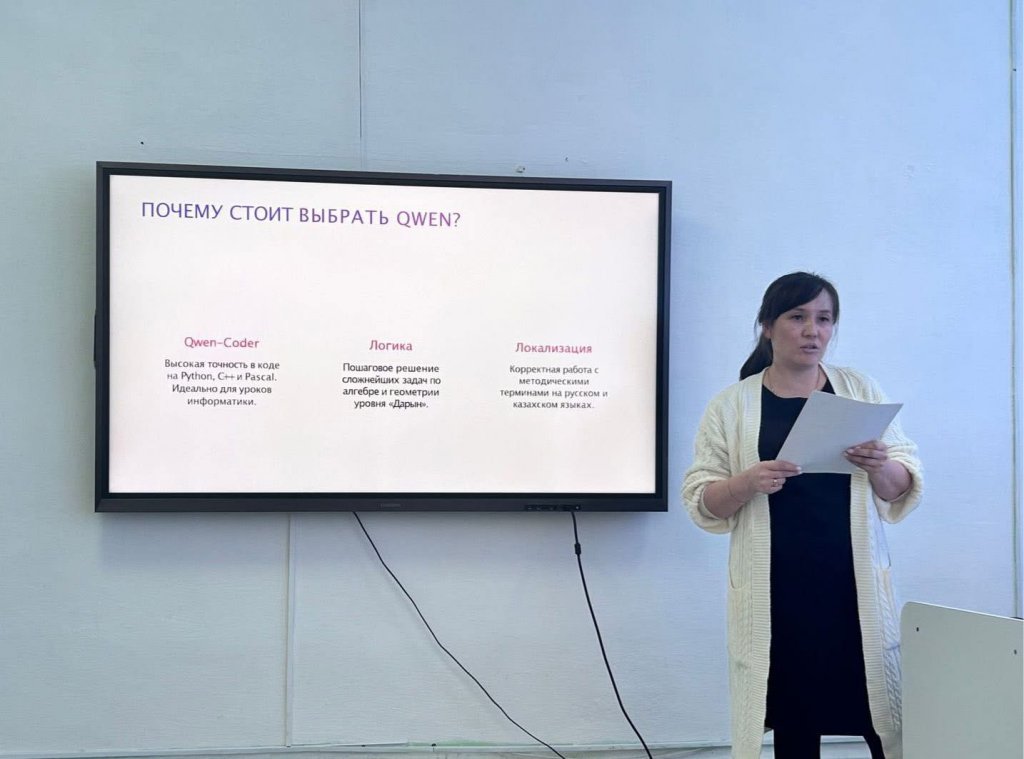 Өз сөзінде ол жасанды интеллекттің сабаққа дайындықты автоматтандыруға, тапсырмалар мен тесттер құрастыруға, сондай-ақ оқушылармен жедел кері байланыс орнатуға көмектесетінін атап өтті. Тәжірибе жүзінде Qwen бағдарламасының жұмысы көрсетіліп, оның оқу материалдарын құрастыру және есептерді шешудегі мүмкіндіктері таныстырылды.