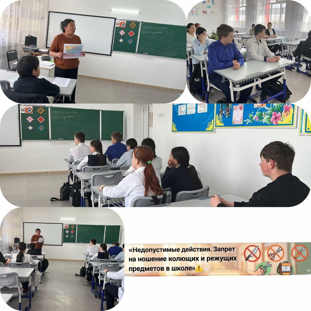 7-сынып оқушыларымен «Жол берілмейтін әрекеттер. Мектепке үшкір және кесетін заттарды алып келуге тыйым салу» тақырыбында әңгіме өткізілді. Оқушыларға мектептегі тәртіп ережелері мен қауіпсіздікті сақтаудың маңыздылығы түсіндірілді.