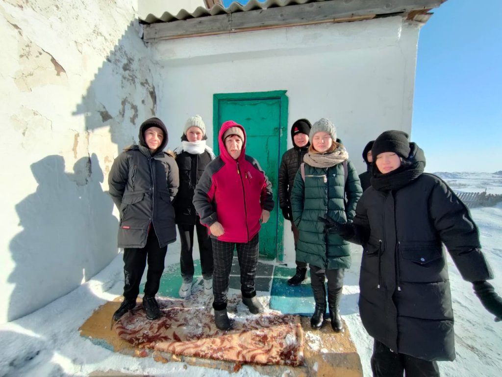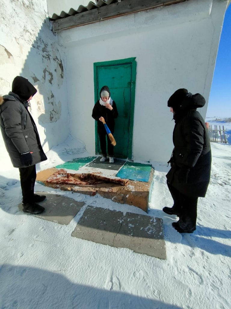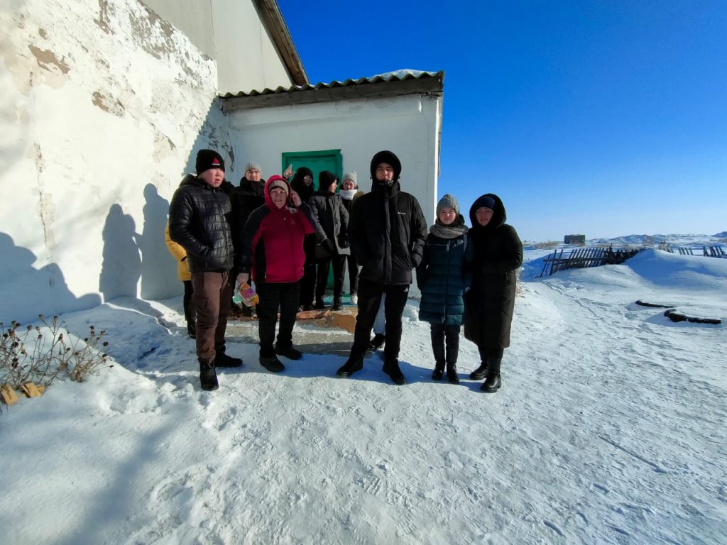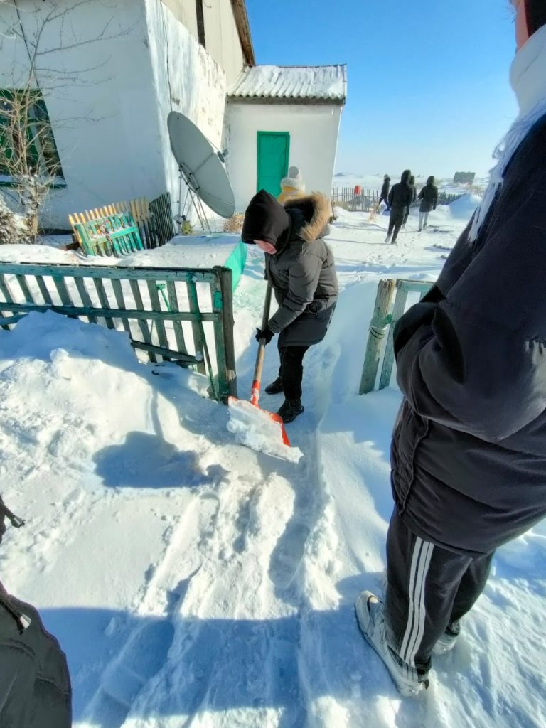 Волонтерлер-тәлімгер Н.Н. Комбатурованың жетекшілігімен жалғыз тұратын зейнеткердің ауласы мен жолын қардан тазартты.